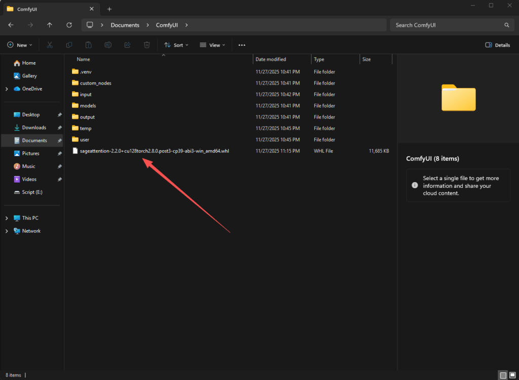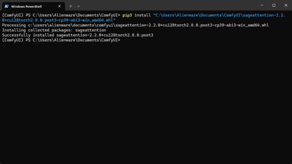 pip3 install "C:\Users\你的用户名\Documents\ComfyUI\sageattention-2.2.0+cu128torch2.8.0.post3-cp39-abi3-win_amd64.whl"